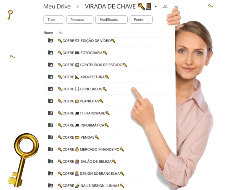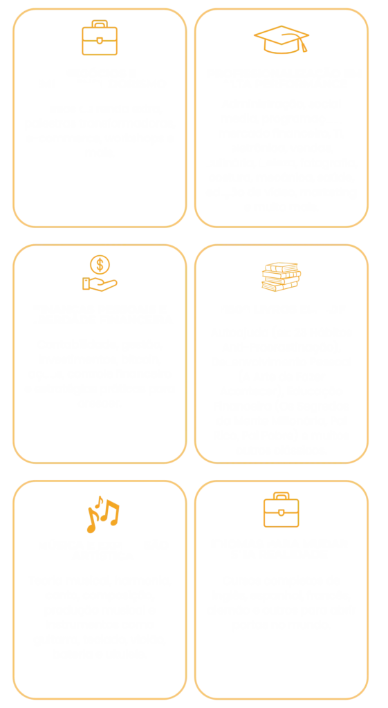 Você terá acesso vitalício a uma pasta organizada com milhares de conteúdos entre cursos, livros, bônus e materiais para desenvolvimento pessoal, profissional e financeiro. Tudo em um só lugar, sem mensalidade.